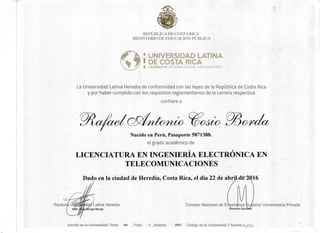El documento certifica que Rafael Antonio Cosio Borda completó con éxito sus estudios en Ingeniería Electrónica en Telecomunicaciones en la Universidad Latina Heredia de Costa Rica. El título fue otorgado el 22 de abril de 2016 y lleva el sello del Consejo Nacional de Enseñanza Superior Universitaria Privada. La apostilla legaliza la autenticidad de la firma, la capacidad del firmante y el sello en el documento.
