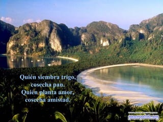El documento habla sobre las consecuencias de las acciones que sembramos. Indica que plantar cosas positivas como árboles, flores, trigo, amor, alegría, vida, verdad y fé trae consecuencias positivas como alimento, perfume, pan, amistad, felicidad, milagros y confianza, mientras que sembrar cosas negativas como tristeza, discordia, ira e injusticia trae consecuencias negativas como amargura, soledad, tempestades, enemistades y abandono. Nos insta a escoger