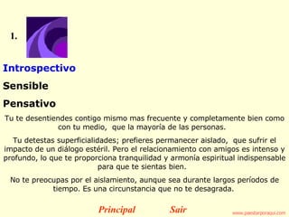 Este documento presenta nueve tipos básicos de personalidad representados por nueve dibujos creados por un psicólogo. Cada dibujo describe brevemente las características principales de cada tipo de personalidad, incluyendo cualidades como introvertido, independiente, dinámico, objetivo, profesional, tranquilo, despreocupado, romántico y analítico. Al final, se proporciona un enlace a un sitio web que ofrece fondos de pantalla, refranes, directorios, horóscopos, chistes y otros conten