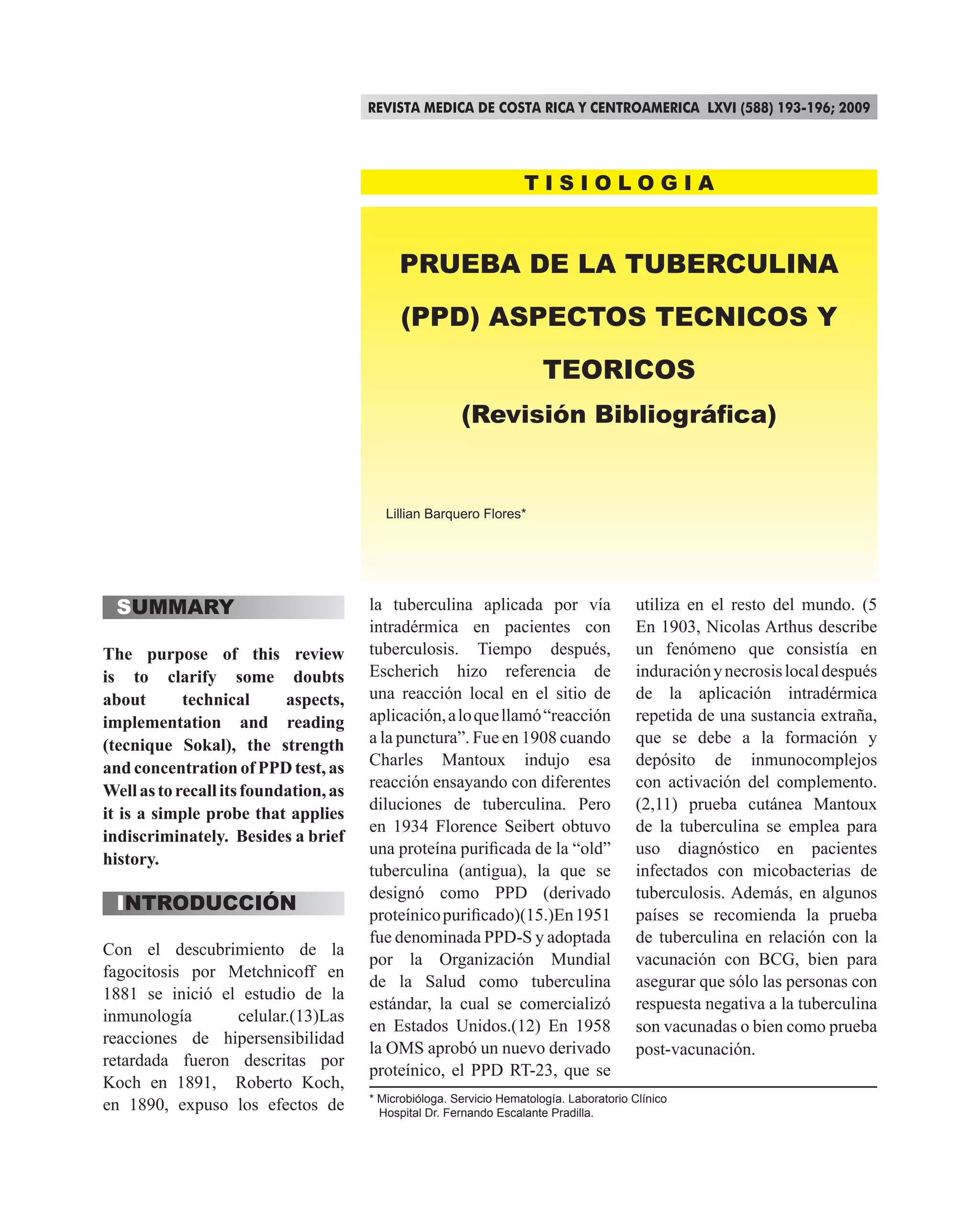 El propósito de esta revisión es aclarar algunos aspectos técnicos y de aplicación de la prueba de la tuberculina (PPD), como la dosificación, concentración e interpretación de los resultados. Además, brinda una breve reseña histórica sobre los orígenes y desarrollo de esta prueba diagnóstica simple y ampliamente utilizada.