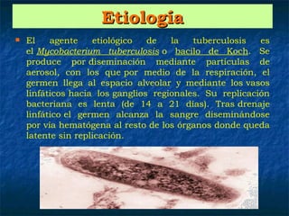 La tuberculosis es causada por la bacteria Mycobacterium tuberculosis. Se transmite a través de pequeñas partículas en el aire cuando personas infectadas tosen, estornudan o esputan. Los síntomas pueden incluir tos con flema, fiebre, sudores nocturnos y pérdida de peso. La tuberculosis puede afectar los pulmones u otros órganos, y se clasifica dependiendo de si hay exposición, infección o enfermedad activa.