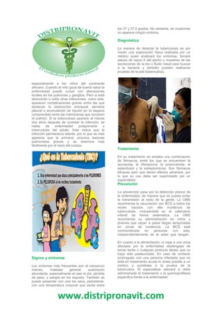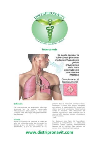 La tuberculosis es una enfermedad infecciosa causada por la bacteria Mycobacterium tuberculosis que ataca principalmente los pulmones. Se transmite a través del aire cuando personas infectadas tosen, estornudan o hablan. Existen dos tipos principales, la pulmonar y la extrapulmonar. El diagnóstico se realiza mediante exámenes físicos, rayos X y pruebas para detectar la bacteria. El tratamiento implica una combinación de medicamentos bajo supervisión médica. La prevención incluye la vacunación BCG, dete