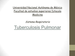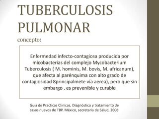 1) La tuberculosis pulmonar es una enfermedad infecciosa causada por la bacteria Mycobacterium tuberculosis, que se transmite principalmente por vía aérea y afecta principalmente los pulmones.