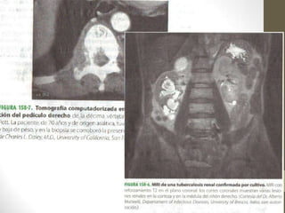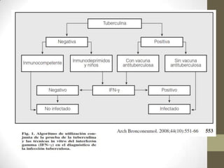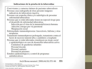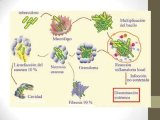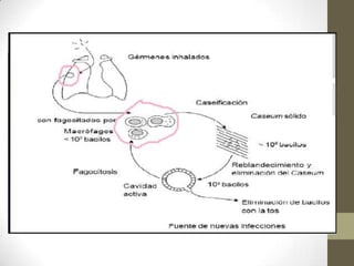 2) Los síntomas incluyen fiebre, pérdida de peso, tos con expectoración y dolor torácico. La radiografía de tórax puede mostrar lesiones, nódulos o cavidades pulmonares.