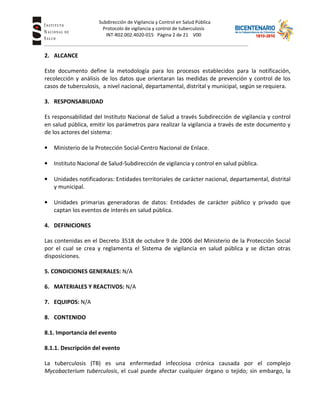 Este documento establece el protocolo de vigilancia de tuberculosis en Colombia. Su objetivo es realizar el seguimiento continuo de los casos de tuberculosis para generar información que oriente las medidas de prevención y control. Describe la importancia de la tuberculosis a nivel mundial y nacional, señalando que continúa siendo una de las principales causas de mortalidad por enfermedades transmisibles. En Colombia, la tasa de incidencia ha tenido una tendencia estable en los últimos años, aunque existe subregistro. El documento también define aspectos clave como el agente causal, modos