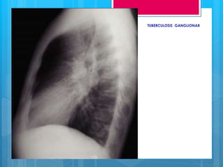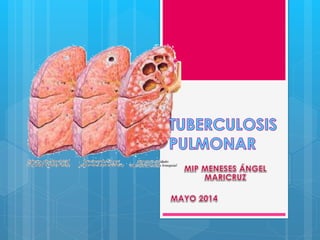 Este documento define la tuberculosis, describe su epidemiología y factores de riesgo, y explica su etiología, fisiopatogenia, manifestaciones clínicas, diagnóstico y tratamiento. La tuberculosis es una enfermedad infecciosa causada principalmente por Mycobacterium tuberculosis. Afecta a una de cada tres personas en el mundo y se transmite por vía aérea. Su diagnóstico incluye exámenes bacteriológicos, radiografías de tórax y pruebas cutáneas. Su tratamiento consiste en una asociación de