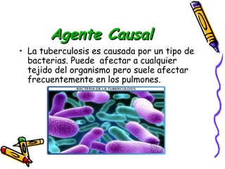 La tuberculosis es causada por una bacteria que se transmite por el aire al toser, estornudar o escupir. Sus síntomas incluyen tos, fiebre leve, pérdida de apetito y peso, sudoración nocturna y dolor en el pecho. El tratamiento requiere tomar varios antibióticos durante al menos seis meses. Se puede prevenir aislando a los enfermos y usando mascarillas para evitar la transmisión de la bacteria por el aire.