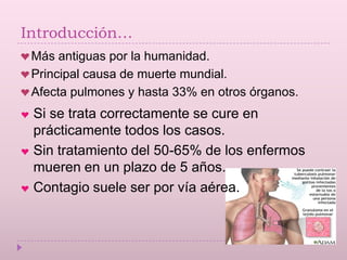 Este documento trata sobre la tuberculosis. Explica que es causada por la bacteria Mycobacterium tuberculosis y afecta principalmente los pulmones. Describe los síntomas, formas de diagnóstico como el examen microscópico y cultivo de muestras, y tratamiento basado en el uso combinado de isoniazida, rifampicina, pirazinamida y etambutol. Resalta la importancia de completar correctamente el tratamiento para evitar la resistencia a los medicamentos.