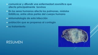 La tuberculosis bovina es una enfermedad zoonótica causada por Mycobacterium bovis que afecta principalmente a los bovinos y puede transmitirse a los humanos. Es una enfermedad crónica que causa síntomas como fiebre, tos seca y pérdida de peso en los animales. Su diagnóstico requiere pruebas cutáneas o de laboratorio e históricamente ha sido un problema para la salud pública en países con deficiencias en la higiene de la leche y la carne.
