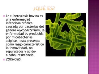 La tuberculosis bovina es una enfermedad crónica causada por la bacteria Mycobacterium bovis que puede infectar al ganado bovino y los humanos. Los síntomas incluyen fiebre, tos, falta de apetito y emaciación. La enfermedad se caracteriza por la formación de granulomas o tubérculos en los pulmones, ganglios linfáticos y otros órganos. El diagnóstico se realiza mediante la prueba de tuberculina y la detección y eliminación de animales infectados es importante para controlar la