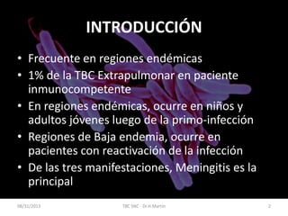 Este documento describe la tuberculosis del sistema nervioso central, incluyendo su patogénesis, manifestaciones clínicas y tratamiento. Discute las tres formas principales (meningitis, tuberculoma y aracnoiditis espinal), destacando que la meningitis es la manifestación más común. Explica que el diagnóstico es difícil y la detección temprana impacta los resultados, enfatizando el análisis de líquido cefalorraquídeo y la importancia de iniciar el tratamiento específico de inmediato ante una alta s