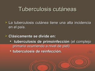 La tuberculosis cutánea puede presentarse como primaria o de reinfección. La primaria es muy rara y se manifiesta como complejo cutáneo. La reinfección incluye formas crónicas como la tuberculosis colicuativa (escrofulodermia), verrucosa, y luposa (lupus vulgar). La colicuativa se caracteriza por nódulos que se ulceran dejando cicatrices. La verrucosa ocurre por inoculación directa y afecta zonas acrales. El lupus vulgar produce placas con costras amarillent