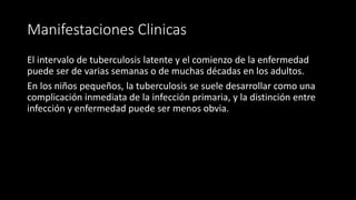 La tuberculosis puede manifestarse de forma asintomática (latente) o sintomática (activa). Los síntomas de la tuberculosis pulmonar primaria en niños incluyen fiebre, pérdida de peso, erupciones cutáneas y sudores nocturnos. El diagnóstico incluye la prueba cutánea de la tuberculina, radiografía de tórax y cultivos de esputo, jugo gástrico u otros fluidos. El tratamiento consiste en una combinación de isoniazida, rifampicina, pirazinamida y otras