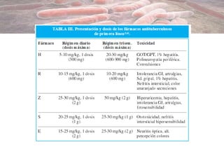 1) La tuberculosis infantil es una enfermedad infecciosa causada por la bacteria Mycobacterium tuberculosis que se transmite por vía respiratoria. 2) Cada año se producen más de 8 millones de nuevos casos de tuberculosis en todo el mundo, de los cuales 1,3 millones son niños, falleciendo 450.000. 3) La forma más frecuente en niños es la pulmonar, aunque también puede presentarse de forma extrapulmonar, como meningitis o adenitis.