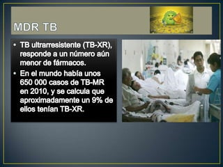 La tuberculosis multirresistente (TB-MR) se define como resistencia a al menos isoniazida y rifampicina. La causa principal es el tratamiento inadecuado de la tuberculosis. El tratamiento de la TB-MR requiere al menos 6 meses de observancia estricta de un régimen con múltiples medicamentos, que puede incluir fluoroquinolonas, aminoglucósidos y medicamentos de segunda línea. La tuberculosis extremadamente resistente (XDR-TB) es aún más difícil de tratar.
