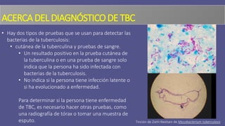 El documento aborda la prueba y diagnóstico de la tuberculosis, destacando las pruebas cutáneas de tuberculina y las pruebas de sangre como métodos para detectar la infección. Se explica la administración, interpretación y las reacciones a la prueba cutánea, así como las condiciones que podrían provocar resultados falsos positivos o negativos. También se menciona la importancia de las pruebas de sangre, especialmente en poblaciones específicas, y la necesidad de realizar pruebas adicionales para confirmar la presencia de enfermedad tuberculosa.