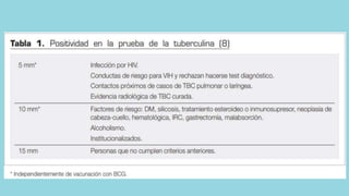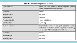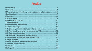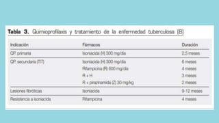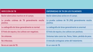 Este documento describe la tuberculosis pulmonar y las prácticas de enfermería comunitaria asociadas. La tuberculosis es una enfermedad infecciosa causada principalmente por Mycobacterium tuberculosis que afecta principalmente los pulmones. Los signos y síntomas incluyen tos prolongada, dolor torácico y pérdida de peso. El diagnóstico se realiza mediante pruebas cutáneas, radiografías de tórax y análisis de esputos, y el tratamiento consiste en una combinación de medicamentos antituberculosos admin