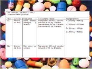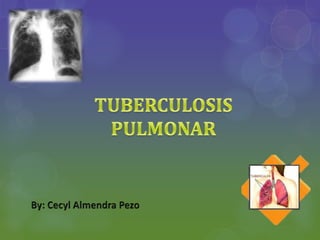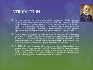 Este documento trata sobre la tuberculosis. Explica que es una infección causada por la bacteria Mycobacterium tuberculosis, describiendo sus síntomas como fiebre, tos y pérdida de peso. También cubre factores de riesgo, diagnóstico a través de radiografías y pruebas cutáneas, y tratamiento mediante medicamentos como isoniazida e internamiento para evitar la propagación.