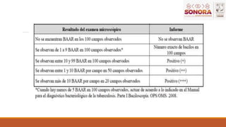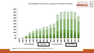 Este documento describe la tuberculosis pulmonar, incluyendo su situación epidemiológica en México y Sonora, definiciones operacionales, grupos de riesgo, síntomas, diagnóstico, y tratamiento. La tuberculosis pulmonar es una enfermedad infecciosa que afecta el parénquima pulmonar, es contagiosa pero prevenible y curable. En México ocupa el tercer lugar en cuanto a incidencia de casos, y los estados con mayor incidencia incluyen Baja California, Sonora, Tamaulipas y Gu