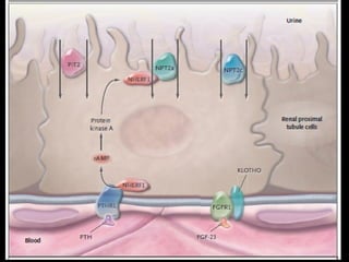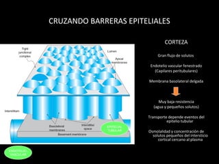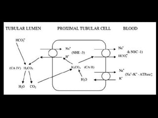 El documento describe los mecanismos de transporte en el túbulo contorneado proximal. Resume que este segmento reabsorbe alrededor del 60% del filtrado glomerular a través de procesos de transporte activo y pasivo. El transporte activo implica cotransportadores y antiportadores como el intercambiador Na-H que facilita la reabsorción de bicarbonato, sodio y agua. También se describen los factores neurohormonales como la angiotensina II que regulan el transporte en este segmento.