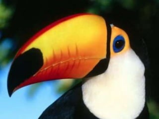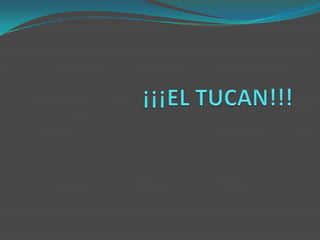 El tucán se distingue por su gran pico colorido y plumaje negro con áreas brillantes. Se alimenta principalmente de frutas debido a su pequeño esófago, y construye nidos complejos para criar sus dos huevos. Habita en selvas y bosques húmedos donde encuentra su dieta de frutas y ocasionalmente otros alimentos como huevos de otras aves.