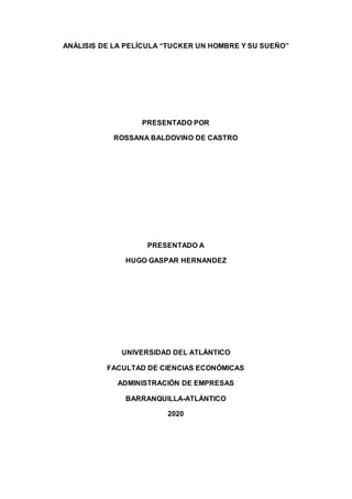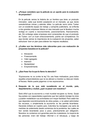 La película narra la historia de Preston Tucker, un emprendedor que desarrolló un automóvil innovador en contra de la oposición de las grandes empresas automotrices establecidas. La película muestra la importancia de la evaluación de proyectos, la financiación, el valor agregado y el emprendimiento. A pesar de enfrentar dificultades, Tucker siguió su visión con la frase motivadora "equivocarse no va contra la ley". El documento analiza los términos relevantes para la evaluación de proyectos según la película