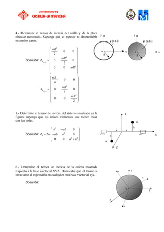 1. El documento presenta varios ejemplos de cálculos de tensores de inercia para diferentes objetos como paralelepípedos, placas, varillas, anillos, esferas y cilindros. Se calculan los tensores de inercia en diferentes bases vectoriales y se piden determinar direcciones y momentos de inercia principales para algunos casos.