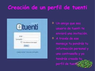 Creación de unperfil de tuenti Un amigo que sea usuario de tuenti te enviará una invitación. A través de ese mensaje tu pondrás tu información personal y una contraseña y ya tendrás creado tu perfil de tuenti .
