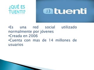 Tuenti es una red social creada en 2006 y utilizada principalmente por jóvenes. Cuenta con más de 14 millones de usuarios. En la página principal los usuarios pueden chatear, ver notificaciones y eventos, subir fotos y comentar en fotos y tablones. También permite enviar mensajes privados y ver videos compartidos y de usuarios.