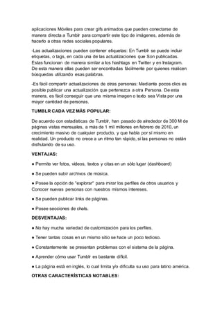 Tumblr es una plataforma para crear microblogs que permite publicar texto, imágenes, videos y otros medios. Ha experimentado un rápido crecimiento, pasando de 300 millones de visitas mensuales en 2010 a más de 1,000 millones en febrero de ese mismo año. Tumblr ofrece diseños atractivos, compartir contenido en otras redes sociales, etiquetas para encontrar publicaciones y facilidad para compartir las actualizaciones de otros usuarios.