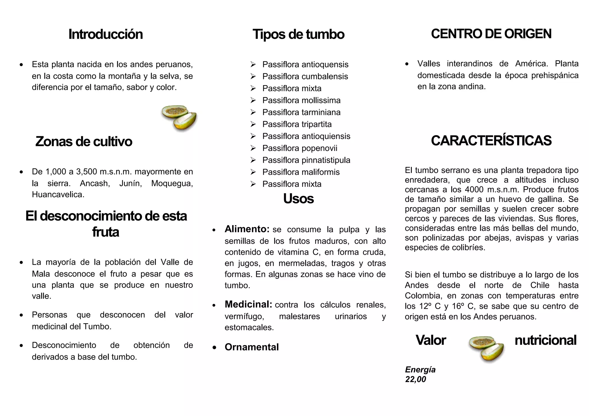 Este documento describe el tumbo, una planta nativa de los Andes peruanos. Crecen en altitudes de 1,000 a 3,500 metros sobre el nivel del mar y producen frutos similares a huevos de gallina. A pesar de que crece en el Valle de Mala, la mayoría de la población no conoce esta fruta ni sus valores medicinales para prevenir enfermedades. El documento también lista los diferentes tipos de tumbo y sus usos como alimento, medicina y ornamental.