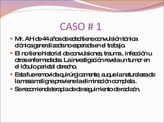 Un hombre de 44 años tuvo una convulsión inesperada en el trabajo. Se le diagnosticó un tumor cerebral en el lóbulo parietal derecho mediante una tomografía computarizada. El tumor fue removido quirúrgicamente, aunque no pudo ser eliminado completamente debido a su naturaleza maligna. Se recomendó radioterapia de seguimiento.