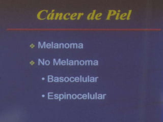 Este documento habla sobre los tumores de la cara, incluyendo el melanoma maligno y los cánceres de piel no melanoma como el basocelular y espinocelular. Describe las características comunes como la edad y exposición a rayos UV. Explica que clínicamente ambos tipos de cáncer no melanoma se ven igual pero se diagnostican histológicamente. También describe signos de malignización como aumento de tamaño, irregularidad y ulceración.