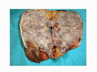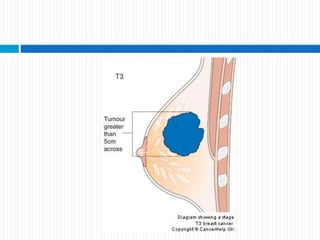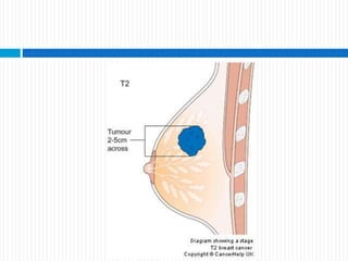 Este documento resume diferentes patologías de la mama, incluyendo cáncer de mama. Describe mastopatía fibroquística, fibroadenomas, tumor filoides y papiloma intraductal como enfermedades benignas comunes. Explica factores de riesgo, etapas, clasificación y tratamiento del cáncer de mama. Resalta que es la primera causa de cáncer en mujeres y que su incidencia aumenta con la edad.