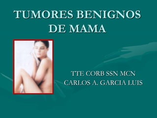 Este documento describe los tumores benignos de mama, incluyendo definiciones, anatomía, clasificaciones, características clínicas y radiológicas. Describe varios tipos de tumores benignos como fibroadenomas, papilomas y adenomas. También cubre displasias mamarias como mastopatía fibrosa, adenosis y la condición fibroquística. Explica los síntomas, diagnóstico y tratamiento de estas afecciones benignas de la mama.