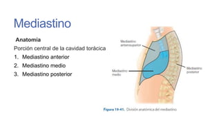 Este documento describe la anatomía del mediastino y los diferentes tipos de tumores que pueden presentarse en esta región, incluyendo su localización, síntomas, estudios de diagnóstico e implicaciones clínicas. Los tumores más comunes son los timomas en el mediastino anterior y los linfomas en cualquier compartimiento. Otras neoplasias descritas incluyen neuroblastomas, teratomas y diferentes tipos de quistes como los pericárdicos y broncogénicos. La biopsia y resección quirúrgica son opciones de diagnóstico