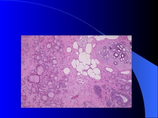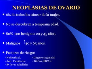 Los tumores de ovario incluyen tumores benignos y malignos. Los tumores malignos más comunes son los serosos, mucinosos y endometrioides. Los tumores de células germinales incluyen teratomas, disgerminomas y tumores del saco vitelino. Los tumores de los cordones sexuales-estroma incluyen tumores de células de la granulosa, tecomas y androblastomas. La mayoría de los tumores de ovario se presentan con dolor abdominal y una masa pélvica.