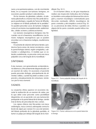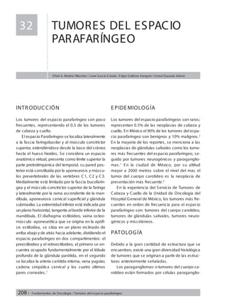 Los tumores del espacio parafaríngeo son poco frecuentes y representan el 0.5% de los tumores de cabeza y cuello. En México, el 90% son benignos y el 10% malignos. Los tumores más comunes son los tumores del cuerpo carotideo, tumores de glándulas salivales como el adenoma pleomorfo, y tumores neurogénicos como el schwannoma. La tomografía computarizada y resonancia magnética son exámenes importantes para el diagnóstico. El tratamiento principal es la cirugía para resecar completamente