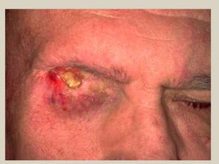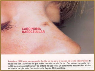 Este documento habla sobre diferentes tipos de tumores y lesiones de la piel. Explica que existen tumores malignos como el carcinoma basocelular, el carcinoma espinocelular y el melanoma maligno. También describe lesiones benignas y premalignas, incluyendo lunares, angiomas, queratosis seborreica y leucoplasia. Finalmente, brinda detalles sobre el diagnóstico, estadificación y tratamiento de estos diferentes tipos de afecciones cutáneas.