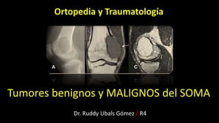 Este documento describe los tumores óseos benignos y malignos. Explica que los tumores óseos primarios son lesiones infrecuentes que representan menos del 0.2% de todos los tumores malignos. Se debe realizar un diagnóstico multidisciplinario que incluya clínica, radiología, anatomía patológica y pruebas de laboratorio. Los tumores se clasifican como benignos, intermedios o malignos dependiendo de características como tamaño, velocidad de crecimiento, infiltración de tejidos y metástasis.