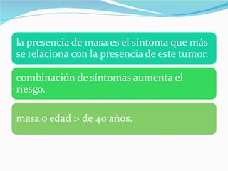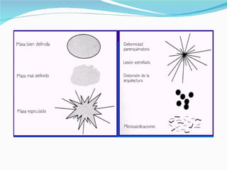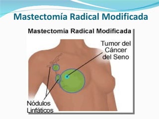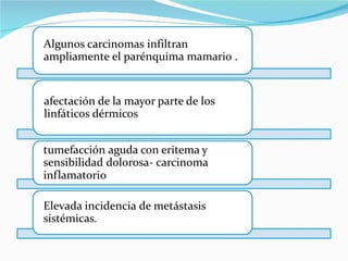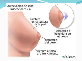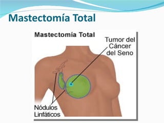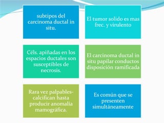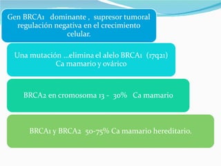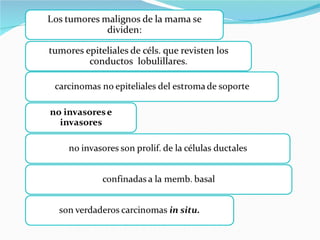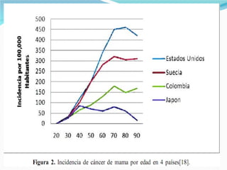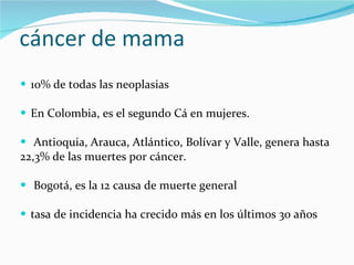 El documento proporciona información sobre el cáncer de mama en Colombia, incluyendo factores de riesgo, síntomas, diagnóstico y clasificación. El cáncer de mama es el segundo cáncer más común en mujeres colombianas. Los factores de riesgo incluyen edad, historia familiar, estilos de vida y factores reproductivos. El diagnóstico se realiza mediante autoexamen, mamografía, ecografía y biopsia. Existen varias clasificaciones para el cáncer de mama según su tipo, tamaño y
