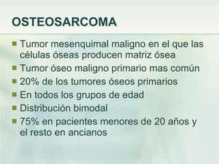 El documento describe los tumores óseos malignos más comunes, incluyendo el osteosarcoma, condrosarcoma y sarcoma de Ewing. El osteosarcoma es el tumor óseo maligno primario más frecuente, que se origina en las metáfisis de los huesos largos. El condrosarcoma es el segundo tumor productor de matriz ósea más común, que produce cartílago neoplásico. El sarcoma de Ewing afecta principalmente a niños y jóvenes, y se caracteriza por translocaciones cromosómicas específicas