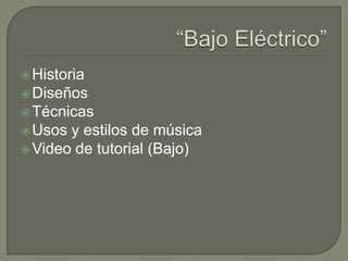 El documento resume la historia, diseños, técnicas y usos del bajo eléctrico. Explica que el bajo eléctrico fue inventado en los años 30 por Paul Tutmarc y que tiene diferentes diseños como cuerpo, mástil y componentes eléctricos. Además, describe varias técnicas para tocarlo como sentado o parado y los diversos géneros musicales donde se usa como pop, reggae, funk y jazz. Finalmente, incluye un enlace a un video tutorial sobre cómo tocar el bajo.