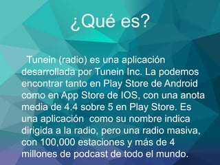 TuneIn es una aplicación gratuita disponible para Android e iOS que ofrece acceso a más de 100,000 estaciones de radio en vivo y más de 4 millones de podcasts de todo el mundo. Los usuarios pueden buscar estaciones por género musical, tipo de contenido o ubicación geográfica, seguir sus estaciones favoritas, y acceder a una interfaz simple para reproducir podcasts y radio en vivo.