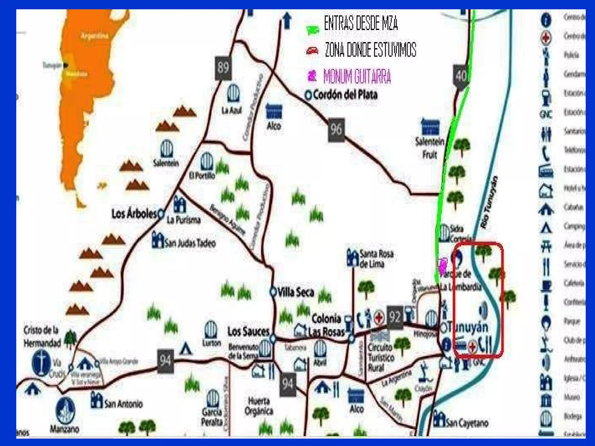 El documento proporciona instrucciones para llegar al Camping Municipal de Tunuyán en Mendoza, Argentina. Indica que hay que tomar la Ruta 40 por 5 km y luego doblar en la calle Uruguay para transitar 6-8 cuadras hasta llegar a la calle Bertona, donde se encuentra la entrada al camping. También menciona que el camping se ubica a orillas del Río Tunuyán.