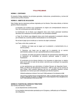 Este documento es un decreto supremo que aprueba el texto único ordenado del código tributario de Perú. El decreto cita otras leyes que han complementado y modificado el código tributario original y establece que es necesario consolidar todas las modificaciones en un texto único ordenado. El decreto aprueba este texto único ordenado del código tributario, el cual consta de un título preliminar, cuatro libros, artículos, disposiciones finales, disposiciones transitorias y tablas de infracciones y sanciones.