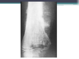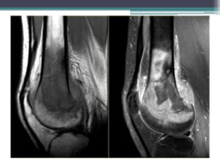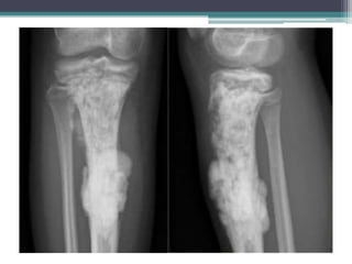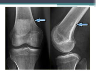 El documento resume diferentes tipos de tumores y lesiones óseas, incluyendo infarto óseo, encondroma, condrosarcoma, displasia fibrosa, metástasis, osteocondroma, osteoma osteoide, osteomielitis, osteosarcoma y fracturas por estrés. Describe las características radiológicas clave de cada una para ayudar con el diagnóstico diferencial.