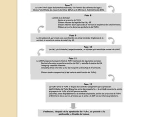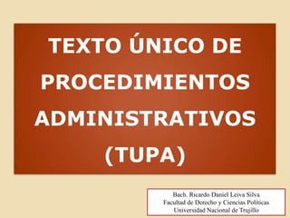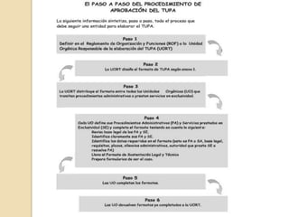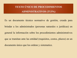 Este documento resume el Texto Único de Procedimientos Administrativos (TUPA). El TUPA es un documento técnico normativo creado para brindar información a los administrados sobre los procedimientos administrativos ante las entidades públicas, incluyendo requisitos, costos y plazos. El TUPA está constituido principalmente por la Ley del Procedimiento Administrativo General y otras normas relacionadas. Las entidades públicas deben contar con un TUPA actualizado cada dos años.