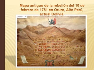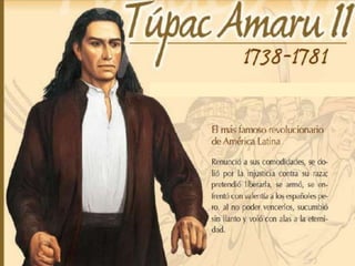Túpac Amaru II fue un líder indígena peruano que lideró una gran rebelión en 1780 contra los españoles y el sistema de gobierno colonial. Nació en 1738 y se casó con Micaela Bastidas en 1760. En 1781, después de liderar una rebelión para obtener derechos para los indígenas, Túpac Amaru II y su familia fueron capturados y ejecutados públicamente por las autoridades españolas.