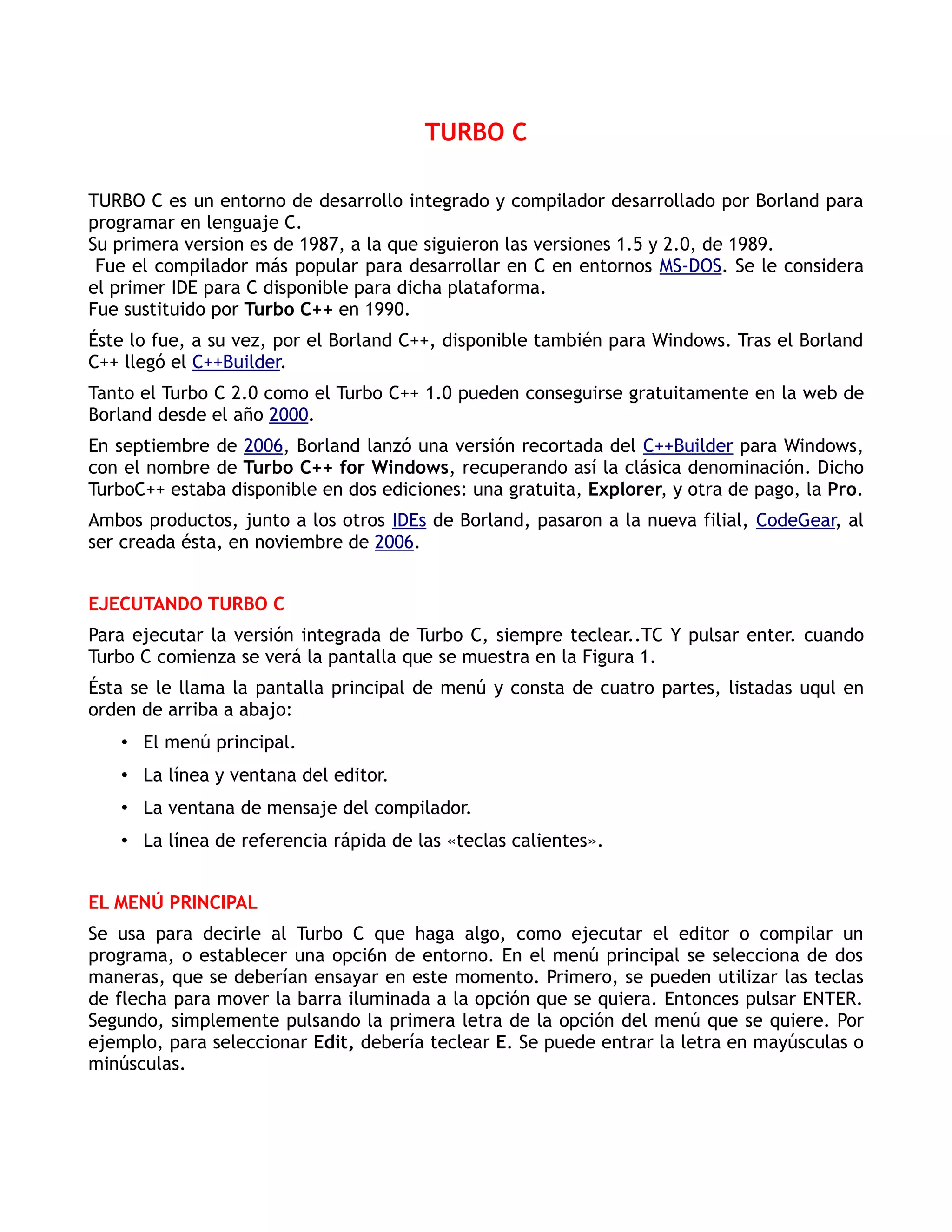 Turbo C fue un entorno de desarrollo integrado y compilador de C popular en los años 80 y 90. Permitía compilar y ejecutar programas en C en sistemas MS-DOS. Fue reemplazado por versiones posteriores como Turbo C++ y C++Builder. El documento describe las características y funcionalidades básicas de Turbo C como su menú principal, editor de código, compilador y depurador.
